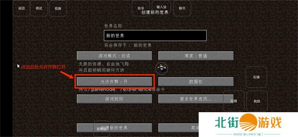 1、创建世界时要将允许作弊改为开,再点击创建世界