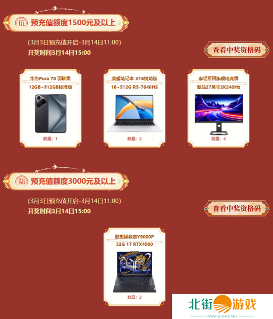 在预充值阶段,累计充值额达到相应的额度即可获得一个抽奖资格码来参与抽奖活动。如玩家在预充值开始后至第七阶段结束前,充值超过最大累计充值额度6000元,则可直接获得7个抽奖码(最多可获得七个抽奖码),以上所有奖励的中奖码必会从各阶段的资格码中产生。