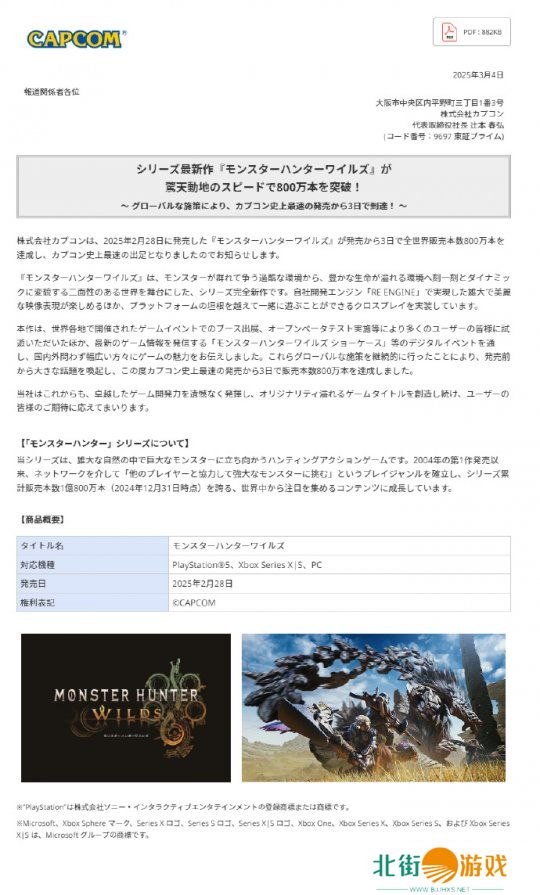 今日,卡普空官方发布公告,正式宣布《怪物猎人:荒野》在发售3天内,销量达到了800万。这是卡普空历史上,最快达成这一成就的游戏,远超以往的同系列作品,以及《生化危机》系列。
