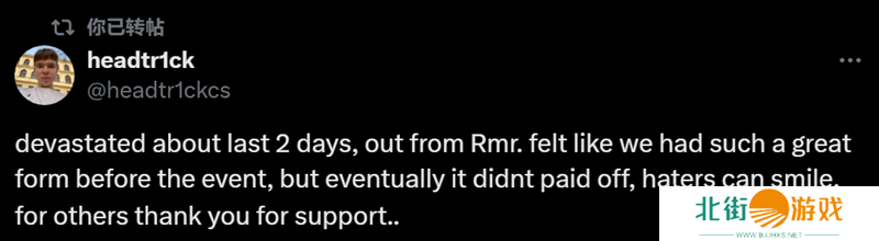 “对过去两天非常失望,我们从RMR出局了。感觉我们在赛前的状态非常好,但最终毫无收获。黑子们可以笑了,至于其他人,感谢你们的支持。”