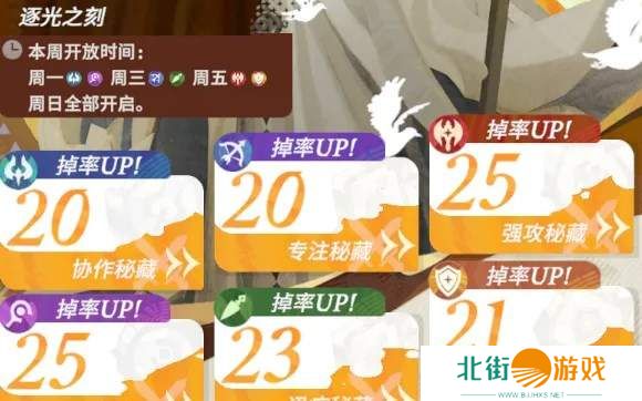 逐光之刻、拥暗之刻将隔天依次开放。周一至周六每天依次开放2个秘藏挑战,每周日将开放指定主题的全部6个秘藏挑战,即每两周为一次完整循环。