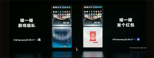 不仅如此,基于鸿蒙系统的特性,联机游戏还能有更多的创新玩法。比如“碰一碰”——通过近场感知技术,两台手机只需靠近就能感知、连接,相互分享淘宝链接、B站视频、KEEP组队跑步……而对游戏来说,这个功能就变成了碰一碰组队、入局,给社交带来了天然的便利。