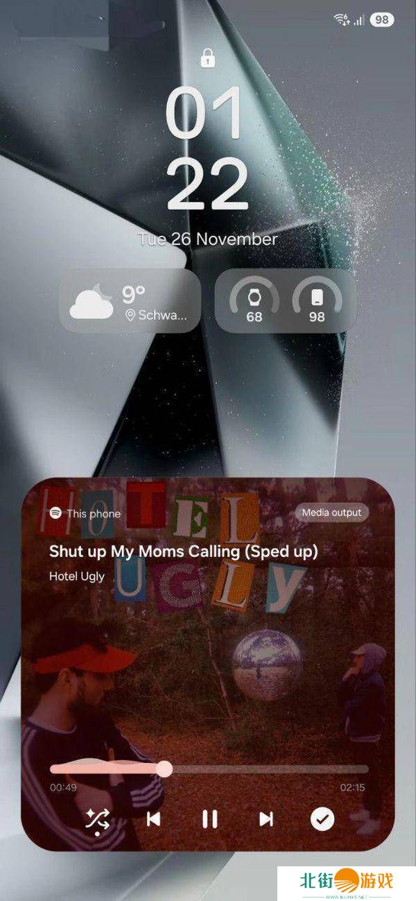 在新的锁屏设计中,底部引入了一个独特的药丸状小部件,这一设计不仅新颖,还非常实用。这个小部件能够动态显示天气信息、已连接设备的电池状态(例如Galaxy Watch)以及媒体播放器控件等。这种设计让用户无需解锁手机就能快速获取所需信息,大大提升了便利性。